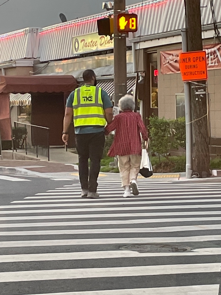 Darin Jones helping an elderly woman cross the street